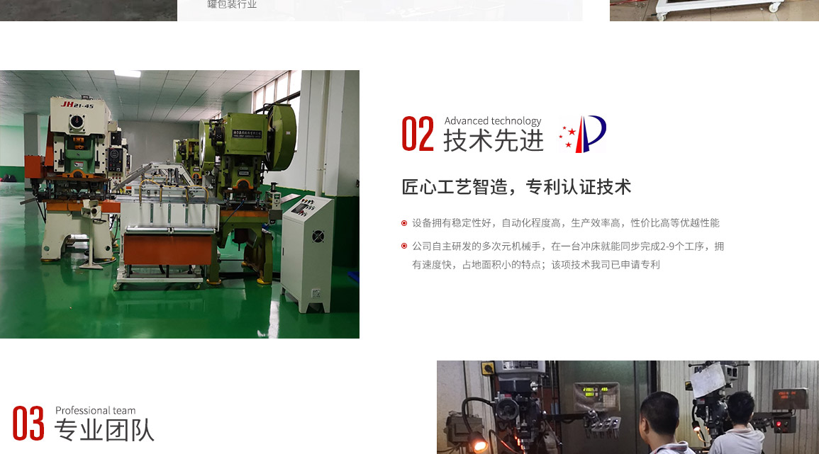 東莞市勝賢機械設備有限公司,是一家專業從事金屬制罐包裝行業的整套自動化設備和模具開發、制造與銷售的公司,擁有成熟的技術和創新開發能力。我們擁有有一批多年從事設計、研究開發的工程師,和設備、模具制作的技術人才。不斷推進制罐行業向高效、環保、節能、操作簡易化的方向發展。 公司主要產品:多次元機械手設備生產:含片盒蓋/底自動生產線,煙盒蓋/底自動生產線,醫藥盒蓋/底自動生產線,茶葉罐蓋圈/酒罐蓋圈自動生產線,酒罐蓋自動生產線、茶葉罐拍底自動生產線等等。 罐身自動扣骨機生產:茶葉罐/酒罐/化妝品罐/內衣罐等等. 其中多次元機械手專為兩片盒的生產和三片罐的蓋、底、蓋圈、拍底蓋等的生產而設計,...